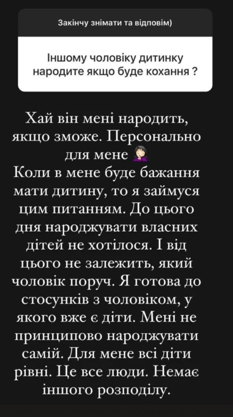 Рамина рассказала, что пока у нее не было желания родить ребенка. Также она пошутила и отметила, что пусть мужчина ей родит сам. Она заявила, что займется этим вопросом, когда появится желание.