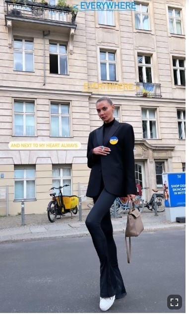 Также Алина показала еще один образ, но на этот раз она была одета уже в черные штаны и голубой свитер с надписью F*ck you Putin. Лук модель дополнила макияжем, стильными очками и кроссовками. На руке у нее висела все та же сумка Hermès.