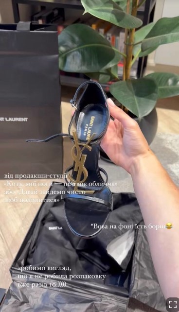 В сторис в Instagram девушка сняла распаковку и похвасталась дорогостоящей покупкой, которую ей сделал мужчина в бутик в Киеве. Как показала Екатерина, Остапчук приобрел ей изысканные чёрные босоножки от Yves Saint Laurent с золотым логотипом бренда спереди.