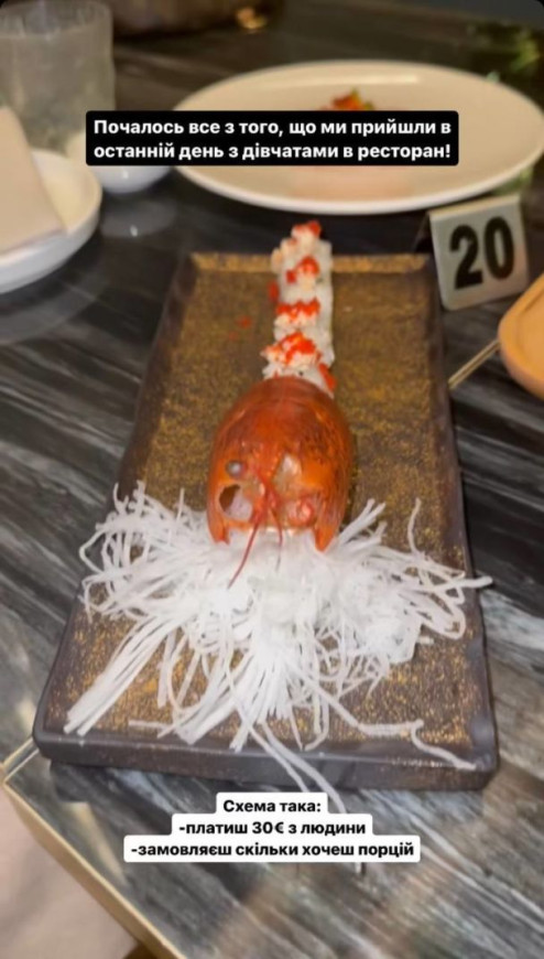 Дело в том, что заведение имеет особую концепцию, по которой гости могут оплатить 30 евро и заказать любое количество блюд из меню при условии, что они их съедят. Однако, по словам певицы, их не предупредили о том, что за оставшиеся блюда все же придется заплатить.