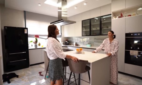 "У нас такое открытое пространство. Это и зал, и кухня. Я всегда хотела, чтобы было такое большое пространство. Все цвета светлые, небесные. Я всегда мечтала, чтобы на кухне был островок", — поделилась Илона.