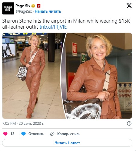 Американская актриса Шэрон Стоун появилась в аэропорту Милана в коричневом кожаном ансамбле от Tod's, а общая стоимость ее образа составила $15 тысяч долларов, пишет Page Six.