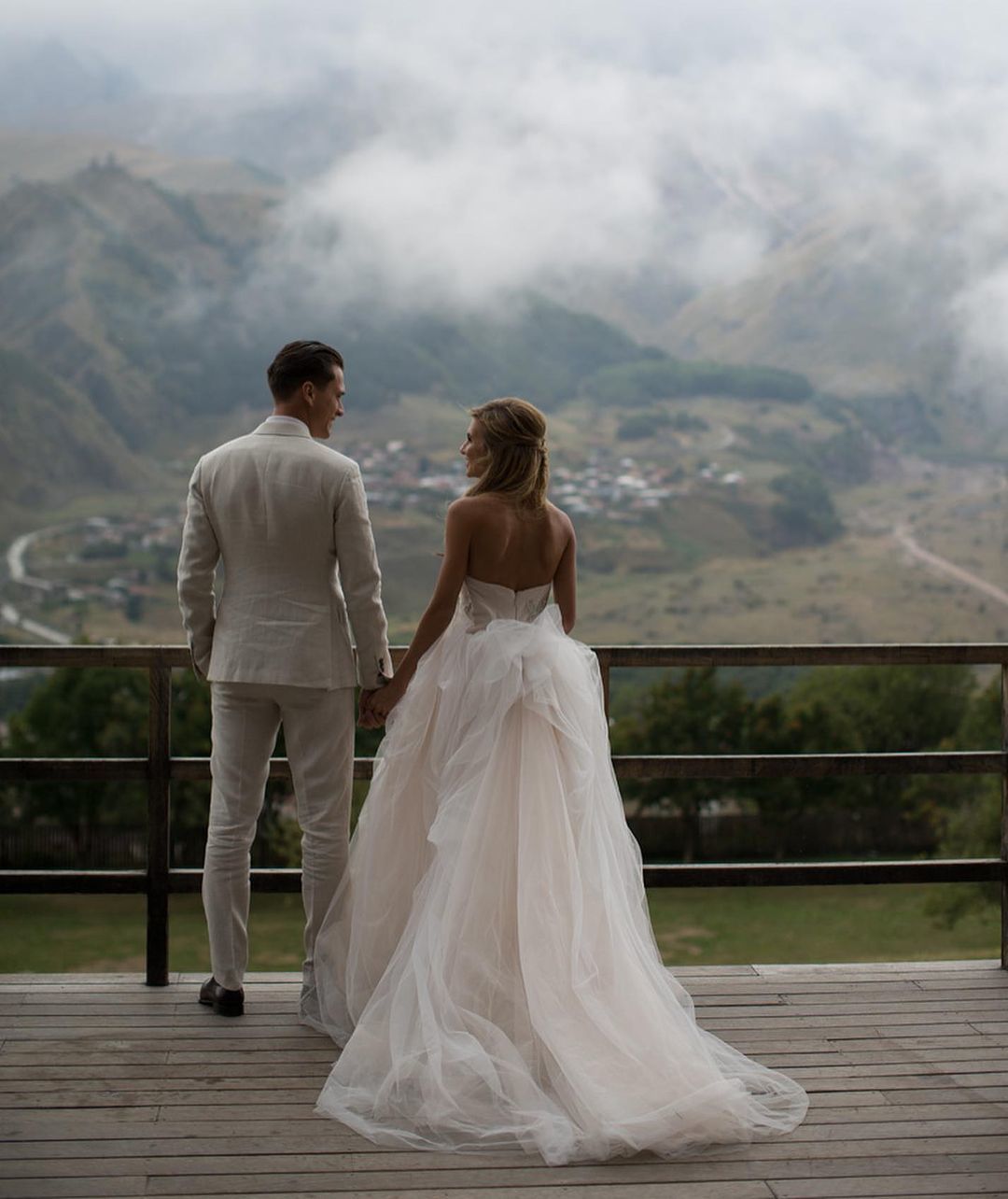На снимках Елизавета была запечатлена в белом платье, а Александр – в светлом костюме. Супруги мило позировали друг возле друга среди гор.