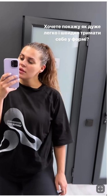 Для занятия спортом певица выбрала обжатые черные лосины, подчеркнувшие ее фигуру, а также футболку оверсайз. Волосы артистка собрала в высокий хвост и не стала делать макияж.
