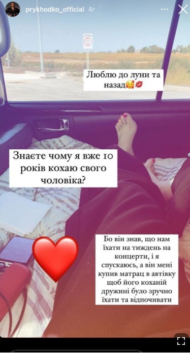 "Люблю до Луны и обратно. Знаете, почему я уже 10 лет люблю своего мужа? Потому что он знал, что нам ехать на неделю на концерты. Я спускаюсь, а он мне купил матрас в автомобиль, чтобы его любимой жене было удобно ездить и отдыхать ", – поделилась артистка.