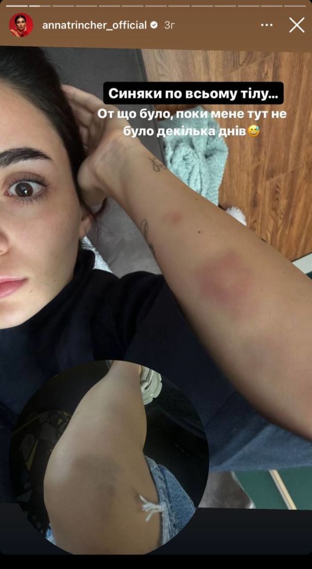 Знаменитость в Instagram-stories опубликовала кадры, на которых показала синяки на руках и ногах. Поклонники начали волноваться и спрашивать, что же произошло. На что Тринчер ответила, что "ее избили".