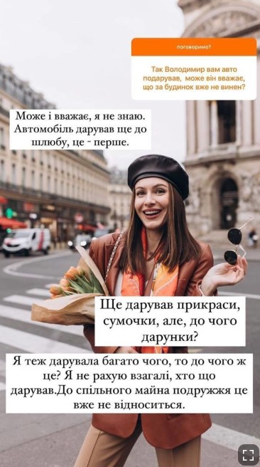 "Может и считает, что ничего не виноват, я не знаю. Автомобиль дарил еще до брака, это – первое. Еще дарил украшения, сумочки, но, к чему подарки? Я тоже дарила многое, то при чем же это? Я не считаю вообще, кто что дарил. К общему имуществу супругов это уже не относится", — сказала Кристина.