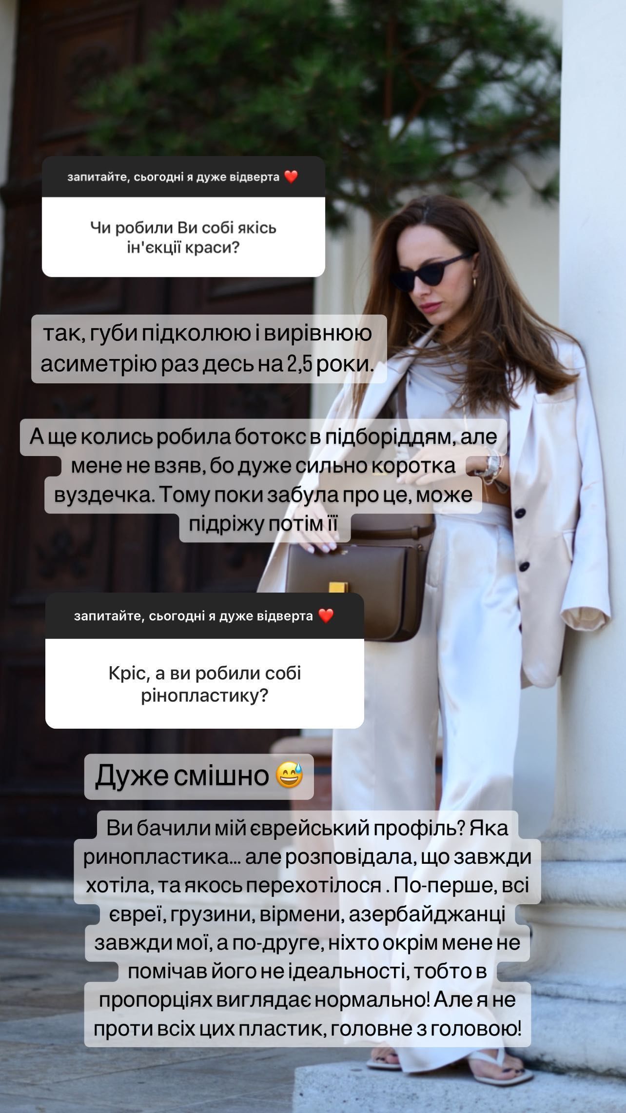 "Очень смешно Вы видели мой еврейский профиль? Какая ринопластика... но рассказывала, что всегда хотела, да как-то перехотелось. Во-первых, все евреи, грузины, армяне, азербайджанцы всегда мои, а во-вторых, никто кроме меня не замечал его не идеальности, то есть в пропорциях выглядит нормально! Но я не против всех этих пластик, главное с головой! Губы подкалываю и выравниваю асимметрию где-то на 2,5 года. А еще когда-то делала ботокс в подбородок, но меня не взял, потому что очень сильно короткая уздечка. Поэтому пока забыла об этом, может подрежу потом", - рассказала Кристина.