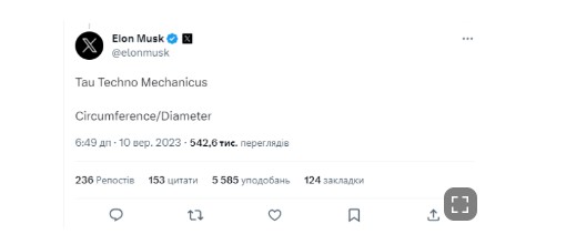 "Тау Техно Механикус. Окружность/Диаметр", — загадочно написал Маск.