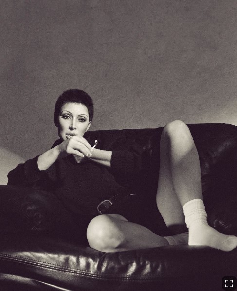 На одном из фото звезда лежала на кожаном диване в оверсайз свитере и белых носках, при этом Ким держала в руках горящую сигарету.
