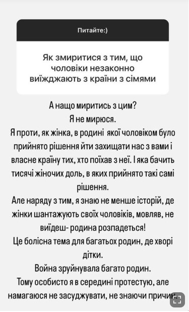Поклонники поинтересовались у знаменитости в Instagram, смирились ли они с тем, что некоторые украинцы незаконно бегут из страны, чтобы не проходить военную службу, в то время как ее муж находится на фронте.