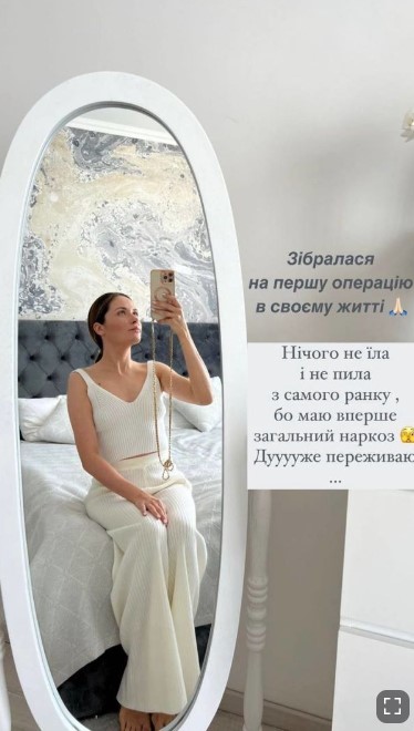 "Собралась на первую операцию в своей жизни. Ничего не ела и не пила с самого утра, потому что у меня впервые общий наркоз. Очень переживаю", — рассказала фанам актриса.
