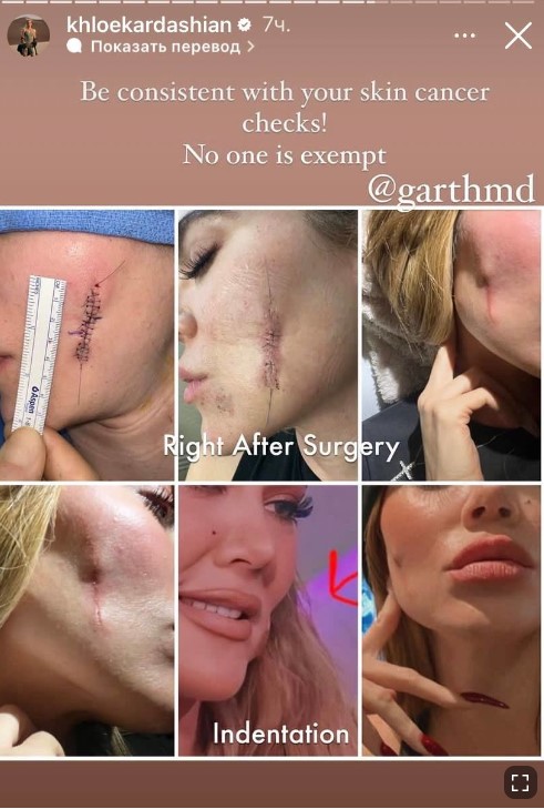 В сторис своей страницы в Instagram бизнесвумен поделилась шокирующими кадрами, как в 2022 году ей сделали операцию на щеке по удалению меланомы. Хлоэ показала швы на своем лице, а также вмятину на щеке, которые остались после раны и многочисленных уколов.
