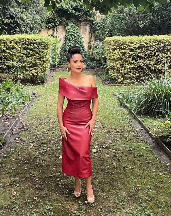 Звезда фильма "Фрида" продемонстрировала фигуру в красном кожаном платье на одно плечо британского бренда Alexander McQueen, который часто выбирает принцесса Уэльская Кейт Миддлтон и королева Иордании Рания. Однако недавно стало известно, что креативный директор бренда Сара Бертон покидает его.
