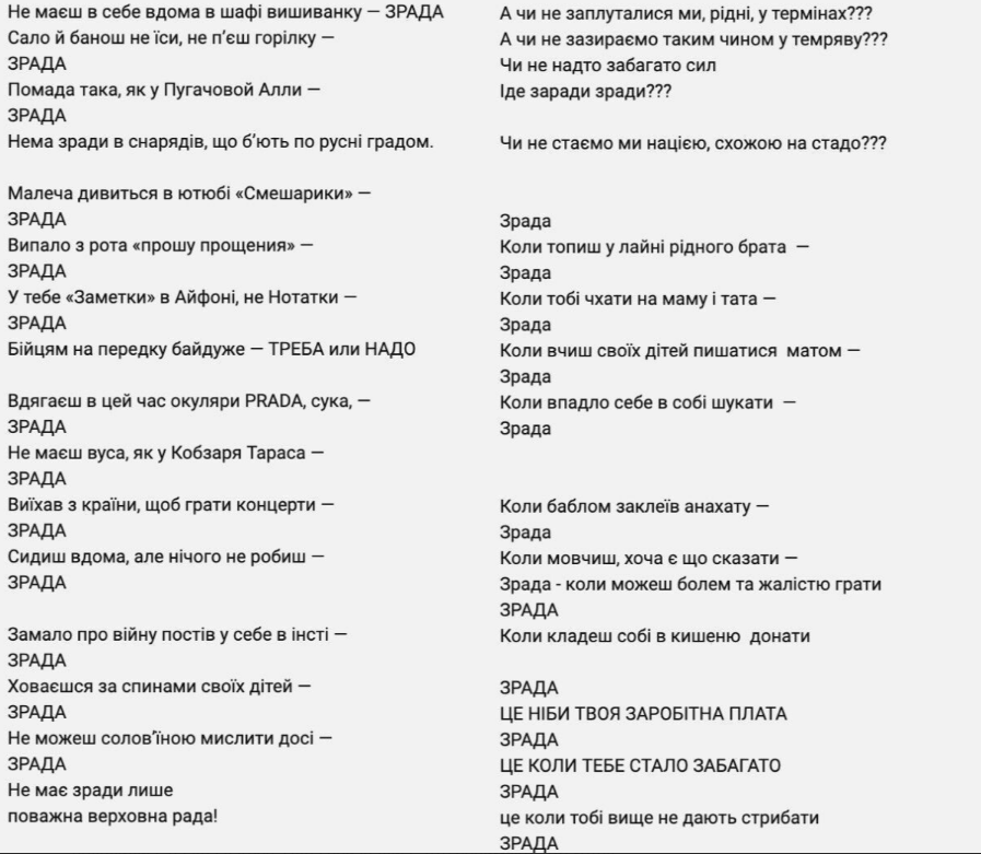 В новой песне Бабкин критикует украинцев, которые, по мнению Сергея, довольно часто обвиняют друг друга в "измене", и гиперболизирует их замечания в адрес друг друга. В частности, в композиции есть следующие строки: "випало з рота "прошу прощения" – зрада", "не маєш в себе вдома в шафі вишиванку - зрада", "у тебе "заметки" в Айфоні, а не нотатки – зрада".