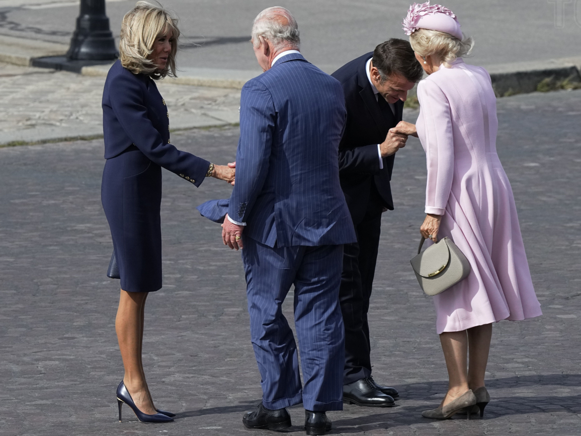 Их первая остановка была у Триумфальной арки, где короля и королеву официально приветствовали президент Эммануэль Макрон и его супруга Брижит. К слову, Триумфальная арка была тем местом, где мать Чарльза, покойная королева Елизавета II, получила торжественный прием во Франции во время своего последнего государственного визита туда в 2014 году.