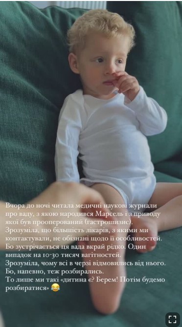 По словам Инны, у 2-летнего мальчика врожденный дефект передней брюшной стенки, который называется гастрошизис. Как только малыш появился на свет, его прооперировали. Жена Мирошниченко отметила, что это крайне редкий порок и случается он один случай на 10-30 тысяч беременностей: