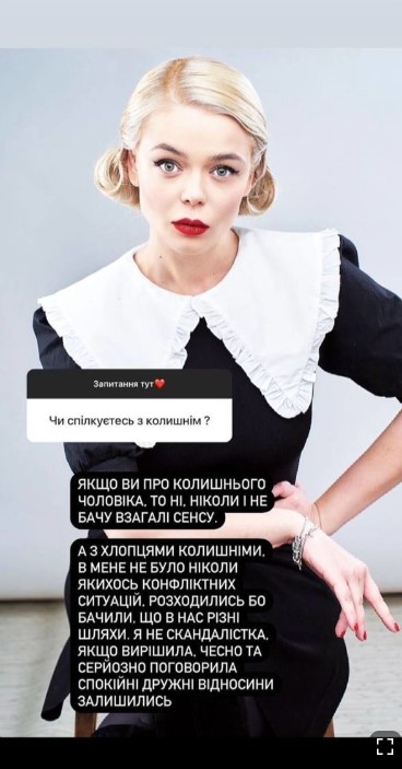 "Если вы о бывшем муже, то нет, никогда. И не вижу вообще смысла. А с парнями бывшими у меня не было никогда каких-то конфликтных ситуаций. Расходились, потому что видели, что у нас разные пути. Я не скандалистка. Если решила - честно и серьезно поговорила. Спокойные дружеские отношения остались", — отметила певица.