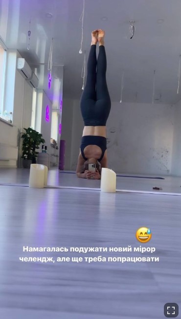Актриса в облегающих лосинах и коротеньком топе показала, как легко может встать на голову из стоячего положения и выровнять ноги в воздухе, да еще и при этом держа в руках телефон. Однако, по словам звезды, она считает, что ей еще предстоит работа над этим трюком.