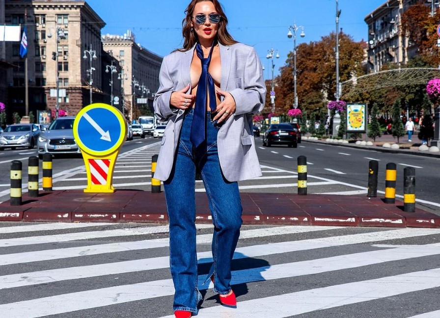 Так, для съемки в центре Киева Саливанчук выбрала джинсы с высокой талией, красные туфли, синий галстук и блейзер, который она надела на голое тело.