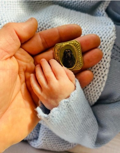 На первом фото рука мальчика, которого назвали Иниго, лежит в руке отца, а тот держит кулон с изображением любимой собаки Джеймса, Эллы, умершей в начале этого года.