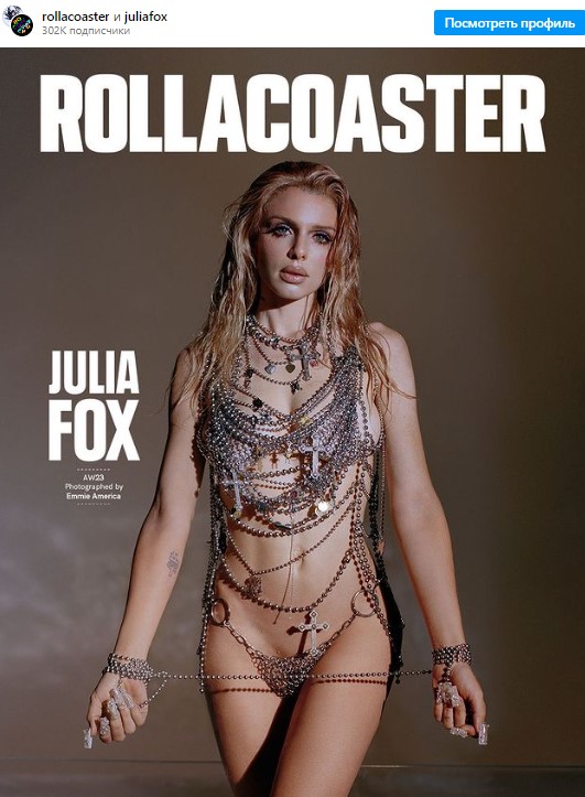 33-летняя итальянская модель и актриса Джулия Фокс, которая строит довольно успешную карьеру в США, продолжает промо своей книги "Down The Drain" ("В канализацию"). На странице в Instagram она опубликовала фото обложки зимнего номера журнала Rollacoaster, на котором предстала в очень откровенном виде.