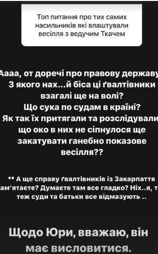 "Из какого беса эти насильники вообще еще на свободе. Что с*ка по судам в стране? Как так: их привлекали и расследовали, что глаз у них не дернулся еще замучить показательную свадьбу", - заявила Ефросинина.