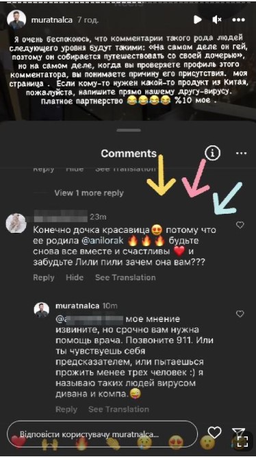 Между тем, бизнесмен находится на своей родине в Турции, где проводит время с 12-летней дочерью от Лорак Софией. Один из пользователей предположил, что в будущем Налчаджиоглу может помириться с Ани Лорак. Этот комментарий Мурат не обошел вниманием и ответил довольно эмоционально: