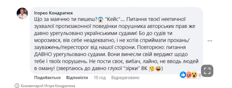 "Что за бред ты пишешь? "Кейс"… Вопрос твоего неэтичного дерзкого противозаконного поведения нарушителя авторских прав уже давно урегулирован украинскими судами! Ведь до судов ты морозился, вел себя неадекватно и не хотел воспринимать просьбы, замечания, предостережения с нашей стороны. Повторяю: вопрос давно урегулирован судами. Они вынесли свой вердикт касательно тебя и твоих нарушений. Не пости свое, извини, дерьмо, не вводи людей в заблуждение!" – заявил Кондратюк.