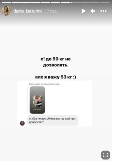 Кстати, за то время, что Кацурина находится в Киеве, она, в частности, успела сделать добрые дела. Так вот, на днях бизнесвумен стала донором крови, о чем рассказала в Instagram. На вопрос фанатов, есть ли какое-либо ограничение по весу для тех, кто хочет сдать кровь, Даша ответила: