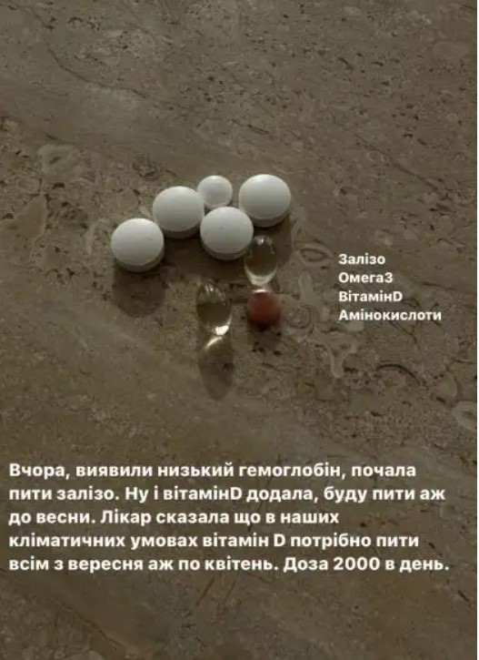“Вчера обнаружили низкий гемоглобин, начала пить железо. Ну и витамин D добавила. Буду пить до весны” – рассказала телеведущая.