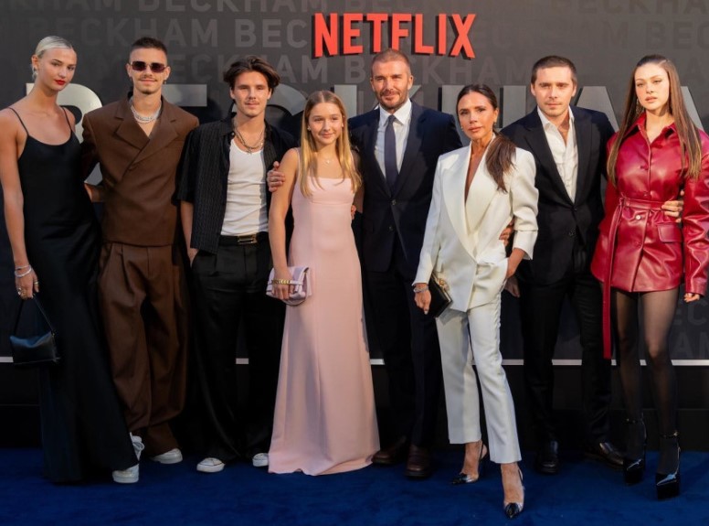 Лишь на последнем фото в карусели Пельтц добавила фотографию вместе со всей семьей Бекхэмов, сделанной во время допремьерного показа. В публикации супруга Бруклина также обозначила всех членов семьи мужа.
