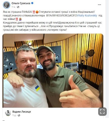 "Какой же страшный позор! Стягивать последние деньги с воина Национальной гвардии, известного певца, волонтера Виталия Козловского во время войны! Кондратюк давно перешел границу в этой теме! Думали, хотя бы в это страшное время придет в себя и остановится… Но нет. Продолжает позориться! Не станут ли эти деньги, которые он забирает у военного, поперек горла?" – написала Сумская.