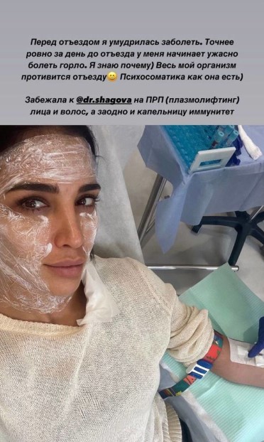 "Перед отъездом я умудрилась заболеть. Вернее ровно за день до отъезда у меня начинает ужасно болеть горло. Я знаю почему. Весь мой организм противится отъезду. Психосоматика как она есть! Забежала к врачу на ПРП (плазмолифтинг) лицо и волосы, а заодно и капельницу иммунитет", — рассказала Димопулос.