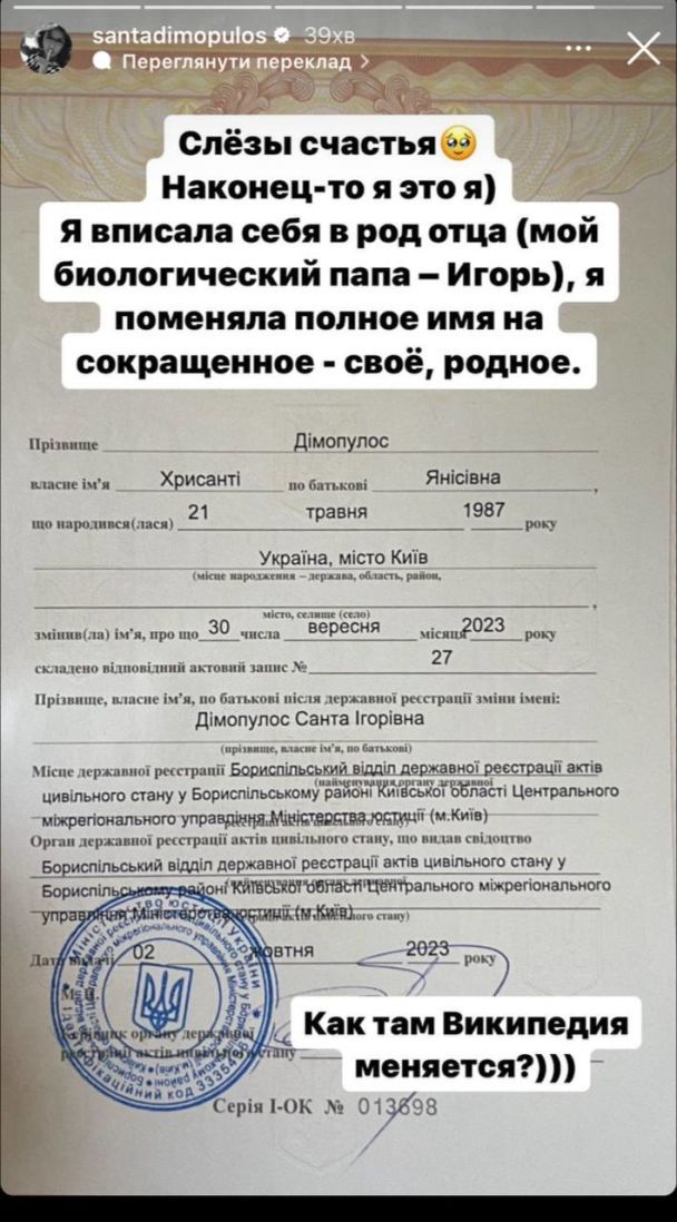 В Instagram-stories артистка поделилась, что наконец-то официально сменила имя и отчество. К слову, по документам исполнительница была Хрисанти Янисовна Димопулос. Впрочем, артистка отныне официально Санта, что является сокращенной формой ее имени.