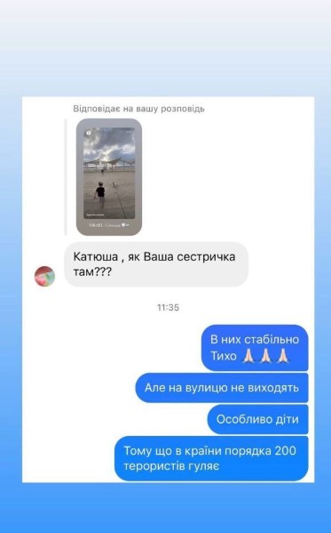 "У нас под домом земля дрожит от взрывов. Громится вдали без остановки. Окна стучат от этой вибрации. Истребители в небе каждые 15 мин. Но мне нравится настроение наших политиков и военных. Лучше один раз пережить, чем жить в страхе всю жизнь. Эта лояльность ни к чему не привела за все эти годы", — высказалась сестра Репяховой.