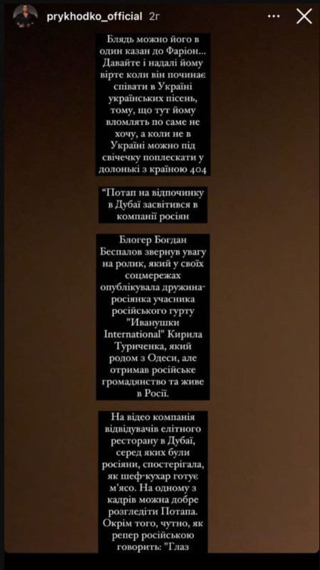 В Instagram-stories артистка обвинила рэпера в неискренности. Она убеждена, что в Украине Потап поет на украинском и выпускает патриотические песни, чтобы иметь расположение среди украинцев. Между тем за границей продюсер, по ее мнению, развлекается и спокойно, несмотря на войну, проводит время в компании россиян.