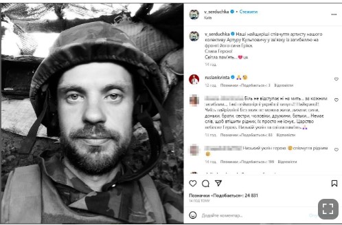 На странице в Instagram Данилко разместил черно-белый кадр, на котором изображен сын музыканта коллектива Сердючки Артура Кульповича Эрик. Исполнитель сообщил, что парень погиб на фронте, защищая Украину: