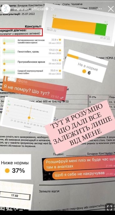 Между тем фанаты MELOVIN предполагают, что у артиста стеатогепатит. В подтверждение этому есть лист с выводом врачей, которым певец поделился в сторис. Там указано, что предварительный диагноз – стеатогепатит с выраженной активностью.