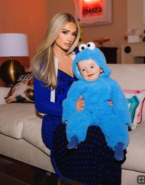 На фотографиях, опубликованных в Instagram Хилтон, звездная мама держит на руках своего 10-месячного сына Феликса в синем пушистом костюме монстрика.