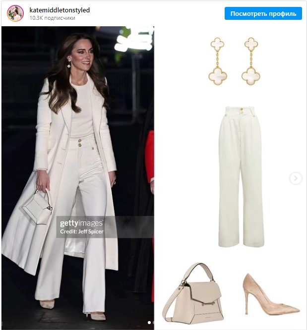 Для своего выхода в свет, Кейт Миддлтон выбрала белоснежный брючный ансамбль и дополнила образ туфельками кремового цвета, а поверх набросила белое пальто от Chris Kerr Bespoke.
