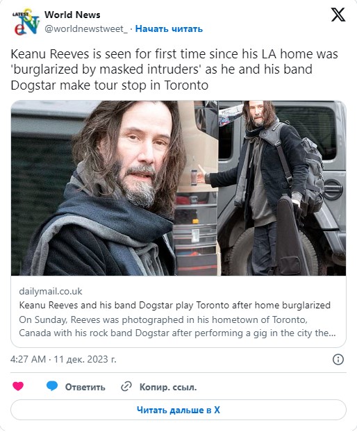 Женщина заявила, что пришла встретиться с ним. Киану спокойно отреагировал на ситуацию, позвонил в полицию, и полицейские взяли ее под стражу для психиатрической экспертизы.