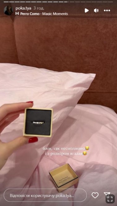 В сторис своей страницы в Instagram избранница ведущего показала, как утром под подушкой нашла коробочку, а в ней лежало кольцо из желтого золота с бриллиантами. Стоимость такого украшения на сайте ювелирного бренда составляет 50 тыс. грн.