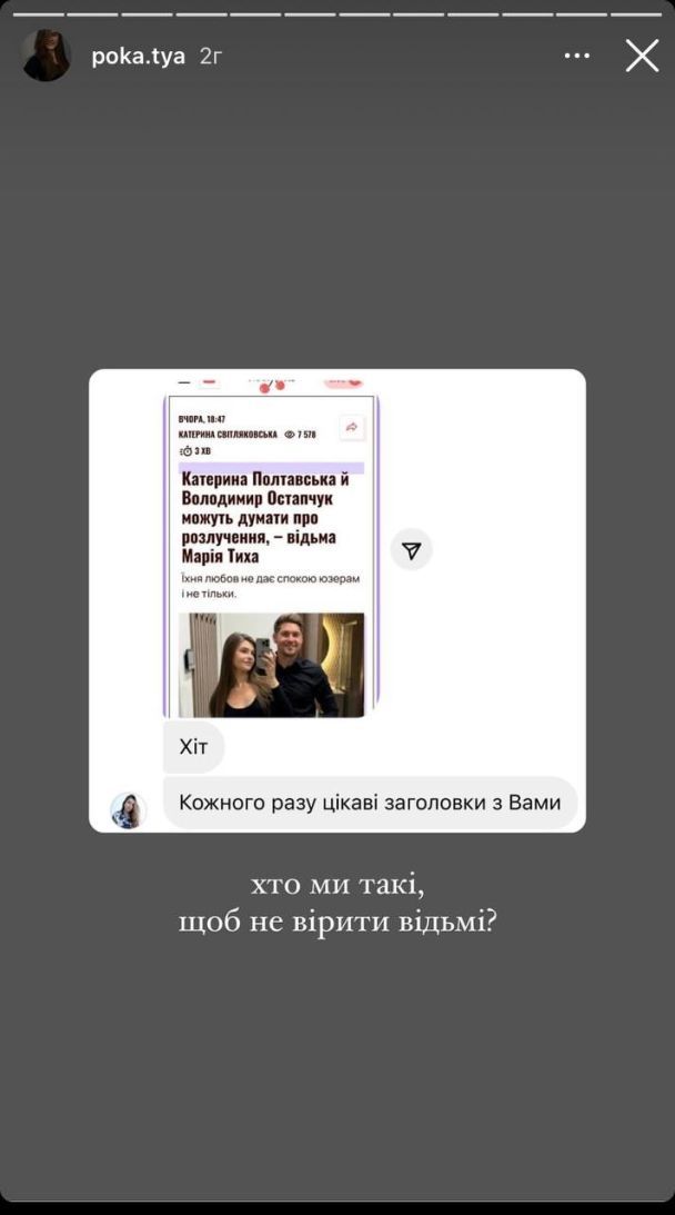 23-летняя жена Владимира Остапчука уже отреагировала на слова Марии Тихой. Екатерина Полтавская не стала вдаваться в конкретику, а лишь пошутила: "Кто мы такие, чтобы не верить ведьме?"