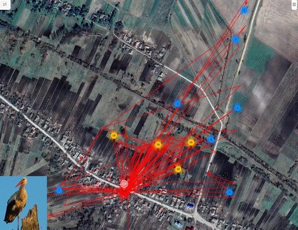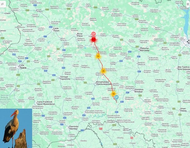 «Наша лелека Збися була дев’ять днів тому поблизу Рівного, Україна. Оскільки вона регулярно зупинялася протягом своєї міграції з Африки, я припустив, що так буде і цього разу. Тим часом птах знаходиться посеред міста, а на карті крупним планом показано гніздо на лінії електропередач», — пишуть науковці.